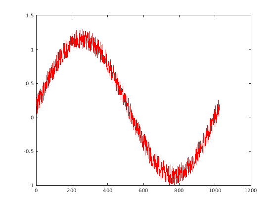 y = averaging_filter_mex(x); % Plot the result when the MEX function is applied to the noisy sine wave. % The 'hold on' command ensures that the plot uses the same figure window as % the previous plot command. hold on; plot(y, 'blue');