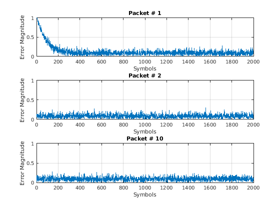 for p=1:numPackets data = randi([0 M-1],numSymbols,1); tx = pskmod(data,M,pi/4); rx = awgn(raylChan(tx),SNR); rxDelay = finddelay(rx,tx); [y,err,wts] = lineq(rx,adaptWeights); y = phaseCorrection(y); evmEst = evm(y); adaptWeights = (evmEst > 20); updateFigures(errPlot,evmPlot,scatSym,adaptState, ... wts,y(end),evmEst,adaptWeights,p,numPackets) end