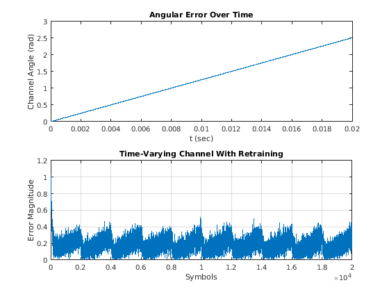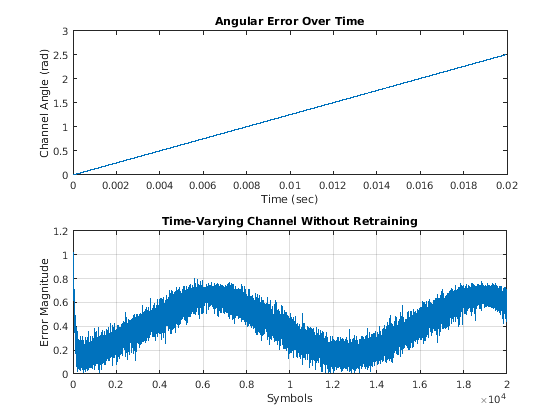 График показывает чрезмерные ошибки вне этих 1 000 периодов подготовки символов. Когда демодуляция символов и вычислительных ошибок символа, с учетом не сходившегося выхода и системной задержки между эквалайзером выход и переданными символами, пропускает первые 2 000 символов.