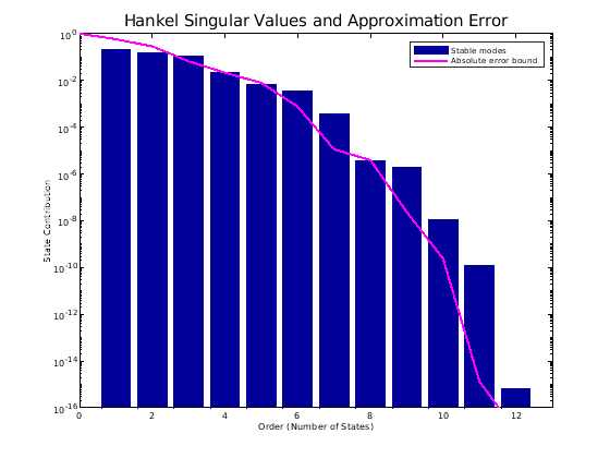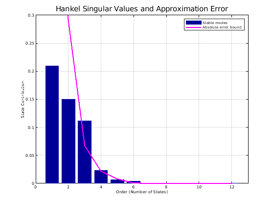 hsvplot(sys) строит сингулярные значения Ганкеля (HSVs) модели LTI sys. Смотрите balred для получения дополнительной информации о значении и цели сингулярных значений Ганкеля. Сингулярные значения Ганкеля для устойчивых и нестабильных режимов sys отображены синим и красным цветом, соответственно. Модели уменьшаемого порядка различных порядков могут быть получены путем отбрасывания состояний, сопоставленных с самым маленьким HSVs. hsvplot также показывает максимальную ошибку приближения в зависимости от порядка приближения (количество состояний в модели уменьшаемого порядка).
