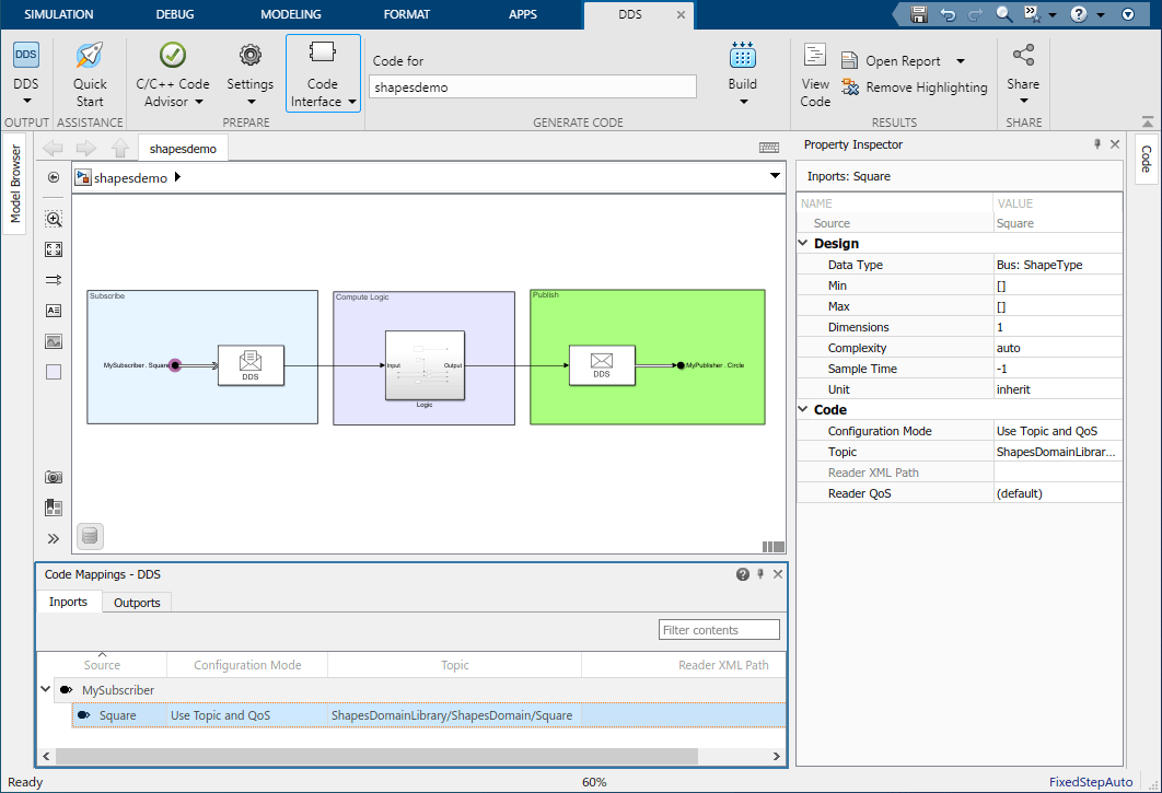 Сконфигурируйте Тему и QoS для импорта, который действует как DataReader. В редакторе Отображений Кода кликните по вкладке Inports: