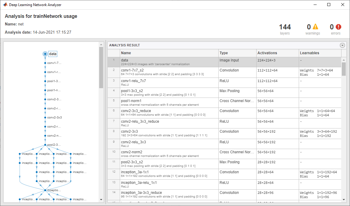 Использование analyzeNetwork чтобы визуализировать и изучить архитектуру сети, проверяйте, что вы задали архитектуру правильно и обнаруживаете проблемы перед обучением. Проблемы это analyzeNetwork обнаруживает включают пропавших без вести или несвязанные слои, неправильно измеренные входные параметры слоя, неправильное количество входных параметров слоя и недопустимые структуры графика.