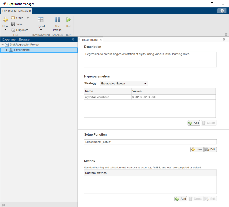 4. Задайте название и местоположение для нового проекта. Experiment Manager открывает новый эксперимент в проекте. Панель Эксперимента отображает описание, гиперпараметры, функцию настройки и метрики, которые задают эксперимент.