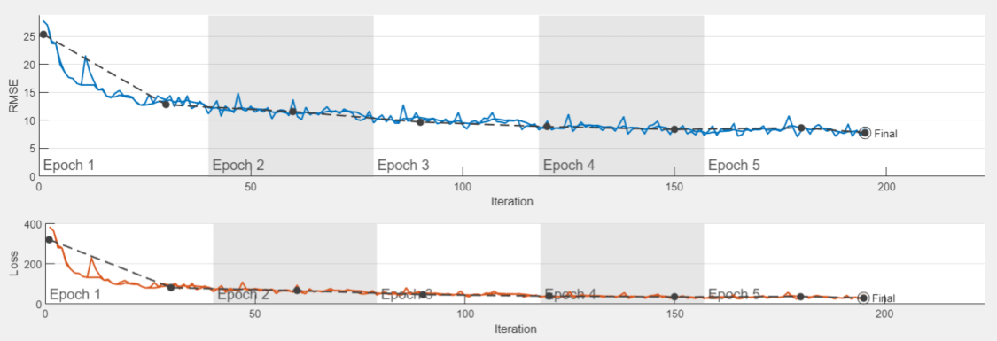Обучите сеть для классификации изображений и задач регрессии с помощью изображений и ответов, заданных images и опции обучения заданы options. |