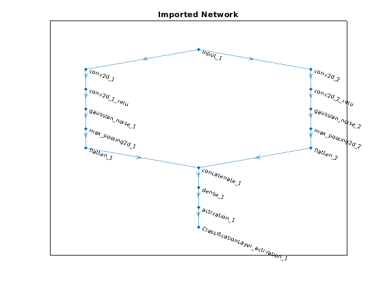 Можно импортировать сеть Keras с несколькими входными параметрами и несколькими выходными параметрами (MIMO). Использование importKerasNetwork если сеть включает входную информацию о размере для входных параметров и информацию о потере для выходных параметров. В противном случае использовать importKerasLayers. importKerasLayers функция вставляет слои заполнителя для вводов и выводов. После импорта можно найти и заменить слои заполнителя при помощи findPlaceholderLayers и replaceLayer, соответственно. Рабочий процесс для импорта сетей MIMO Keras совпадает с рабочим процессом для импорта сетей MIMO ONNX™. Для примера смотрите Импорт и Соберите Сеть ONNX с Несколькими Выходными параметрами. Чтобы узнать о нейронной сети для глубокого обучения с несколькими входными параметрами и несколькими выходными параметрами, смотрите Несколько - Вход и Несколько - Выходные Сети.