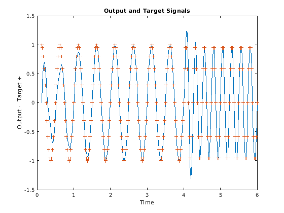 figure plot(timex,cell2mat(Y),timex,cell2mat(T),'+') xlabel('Time'); ylabel('Output - Target +'); title('Output and Target Signals');