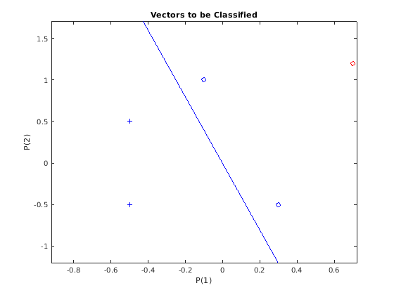 Теперь SIM используется, чтобы классифицировать любой другой входной вектор, как [0.7; 1.2]. График этой новой точки с исходным набором обучающих данных показывает, как сеть выполняет. Чтобы отличить его от набора обучающих данных, окрасьте его в красный.