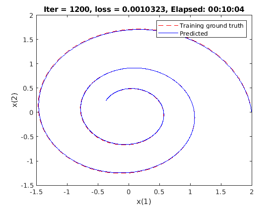 [grads,loss] = dlfeval(@modelGradients,timesteps,dlx0,neuralOdeParameters,targets);