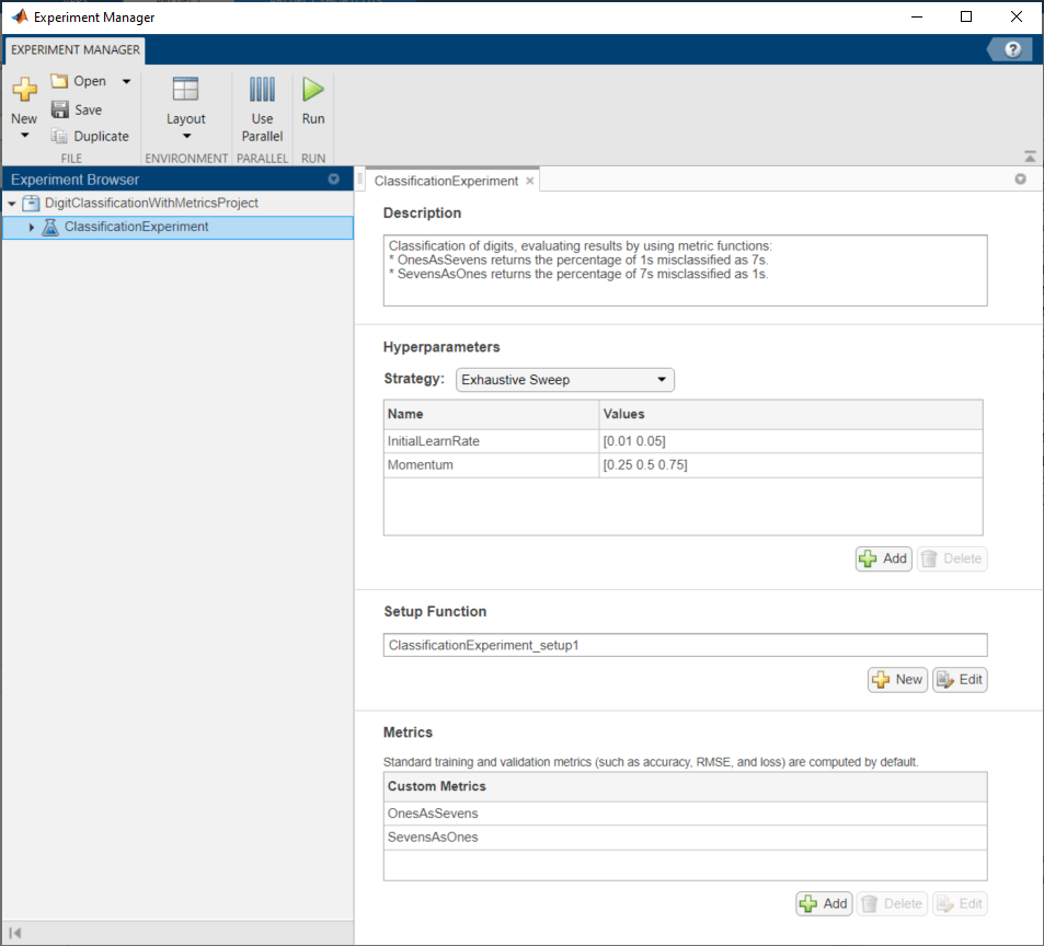 В этом примере вы обучаете сеть, чтобы классифицировать изображения рукописных цифр. Две метрических функции определяют, как хорошо обучивший сеть идентифицирует изображения цифр "один" и семь. Для получения дополнительной информации об использовании Experiment Manager, чтобы обучить сеть для классификации изображений, смотрите Классификацию Изображений путем Развертки Гиперпараметров.