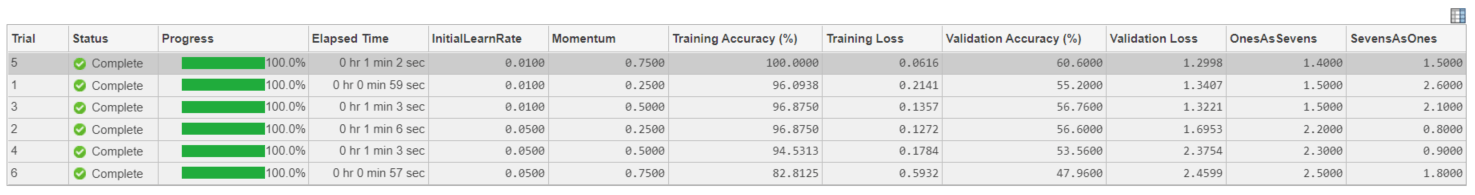 options = trainingOptions("sgdm", ... MaxEpochs=5, ... ValidationData=imdsValidation, ... ValidationFrequency=30, ... InitialLearnRate=params.InitialLearnRate, ... Momentum=params.Momentum, ... Verbose=false);