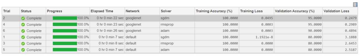 Когда вы запускаете эксперимент, Experiment Manager обучает сеть, заданную функцией настройки шесть раз. Каждое испытание использует различную комбинацию гиперзначений параметров. По умолчанию Experiment Manager запускает одно испытание за один раз. Если у вас есть Parallel Computing Toolbox™, можно запустить несколько испытаний одновременно. Для лучших результатов, прежде чем вы запустите свой эксперимент, начинают параллельный пул со стольких же рабочих сколько графические процессоры. Для получения дополнительной информации смотрите Использование Experiment Manager, чтобы Обучить нейронные сети параллельно и Поддержка графического процессора Релизом (Parallel Computing Toolbox).