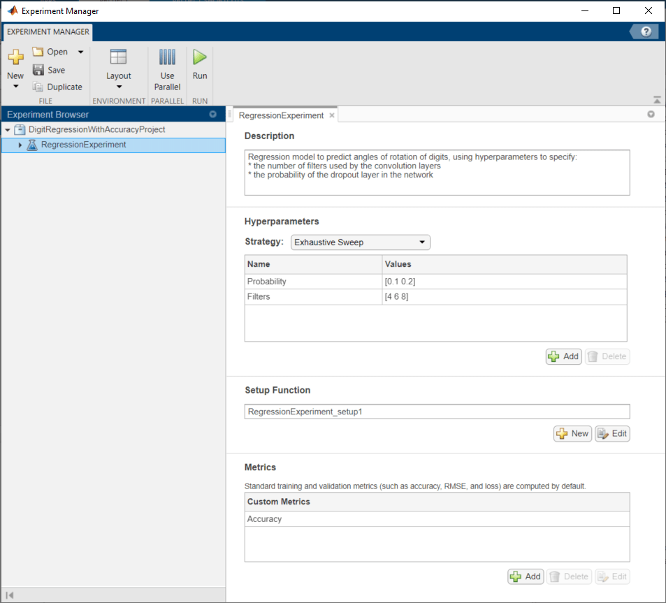 Во-первых, откройте пример. Experiment Manager загружает проект с предварительно сконфигурированным экспериментом, который можно смотреть и запустить. Чтобы открыть эксперимент, в панели Браузера Эксперимента, дважды кликают имя эксперимента (RegressionExperiment).