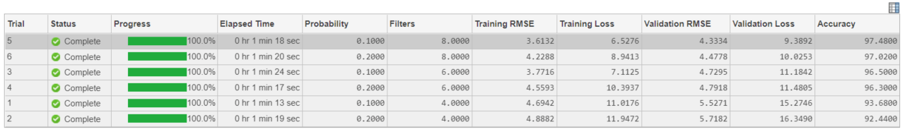 Таблица результатов показывает RMSE и потерю для каждого испытания. Таблица также показывает точность испытания, как определено пользовательской метрической функцией Accuracy.