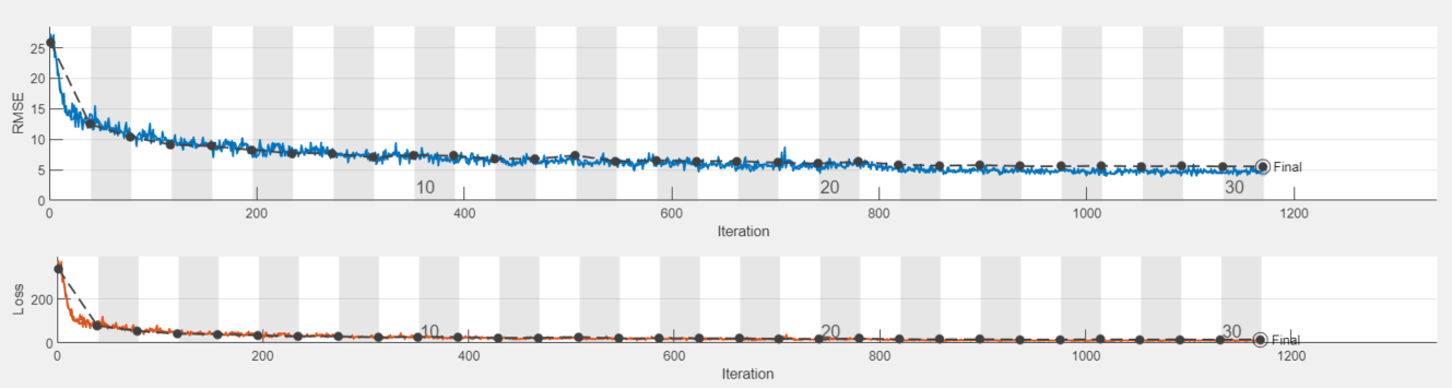 Укажите, что Опции обучения задают trainingOptions объект для эксперимента. Пример обучает сеть в течение 30 эпох. Скорость обучения первоначально 0.001 и понижается на коэффициент 0,1 после 20 эпох. Программное обеспечение обучает сеть на обучающих данных и вычисляет среднеквадратическую ошибку (RMSE) и потерю на данных о валидации равномерно во время обучения. Данные о валидации не используются, чтобы обновить сетевые веса.