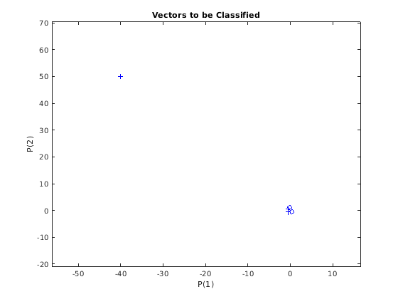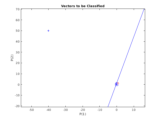 Обратите внимание на то, что 4 входных вектора имеют намного меньшие величины, чем пятый вектор в верхнем левом углу графика. perceptron должен правильно классифицировать эти 5 входных векторов на X в эти две категории, заданные T.
