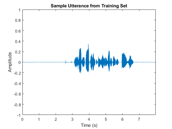 [audioIn,audioInfo] = read(ads); fs = audioInfo.SampleRate; t = (0:size(audioIn,1)-1)/fs; sound(audioIn,fs) plot(t,audioIn) xlabel('Time (s)') ylabel('Amplitude') axis([0 t(end) -1 1]) title('Sample Utterance from Training Set')