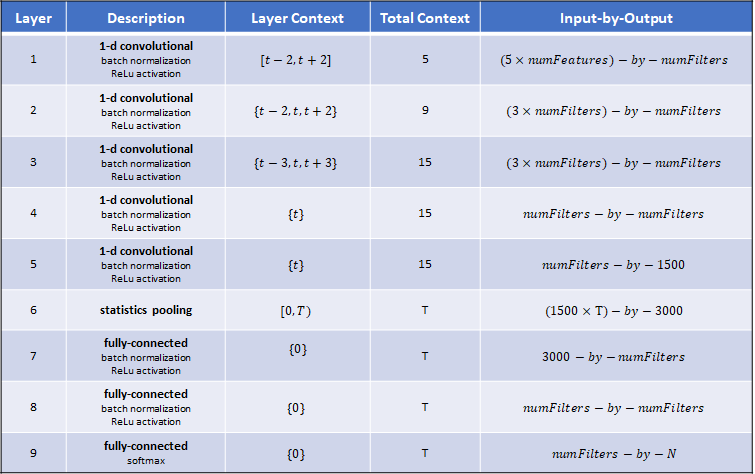 Таблица суммирует архитектуру сети, описанной в [1] и реализованный в этом примере. T является общим количеством систем координат (характеристические векторы в зависимости от времени) в звуковом сигнале. N является количеством классов (динамики) в наборе обучающих данных.