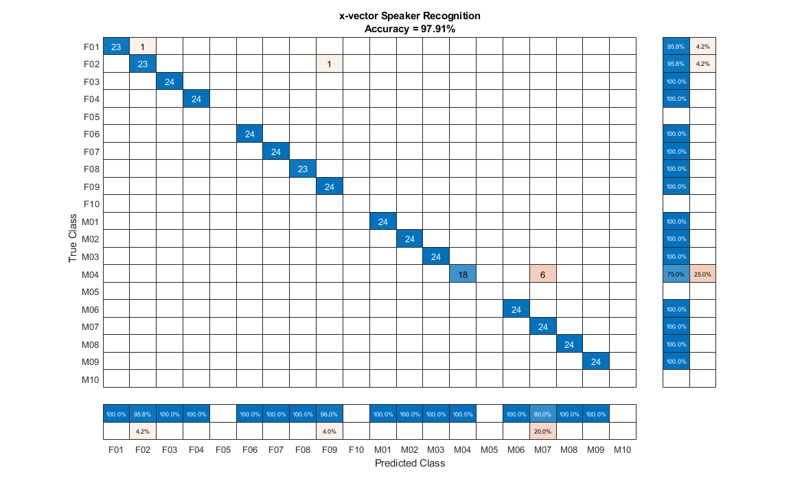 predictedLabels = classes; predictedLabels(:) = []; for sample = 1:numel(adsTest.Files) [audioIn,xInfo] = read(adsTest); audioIn = resample(audioIn,desiredFs,fs); f = xVectorPreprocess(audioIn,afe,'Factors',factors,'MinimumDuration',0); predictions = zeros(numel(classes),numel(f)); for segment = 1:numel(f) dlX = dlarray(f{segment},'SCB'); predictions(:,segment) = extractdata(xvecModel(dlX,parameters,state,'DoTraining',false)); end predictedLabels(sample) = onehotdecode(mean(predictions,2),categories(classes),1); end trueLabels = adsTest.Labels; accuracy = mean(trueLabels==predictedLabels'); figure('Units','normalized','Position',[0.2 0.2 0.6 0.6]); confusionchart(trueLabels,predictedLabels', ... 'ColumnSummary','column-normalized', ... 'RowSummary','row-normalized', ... 'Title',sprintf('x-vector Speaker Recognition\nAccuracy = %0.2f%%',accuracy*100))