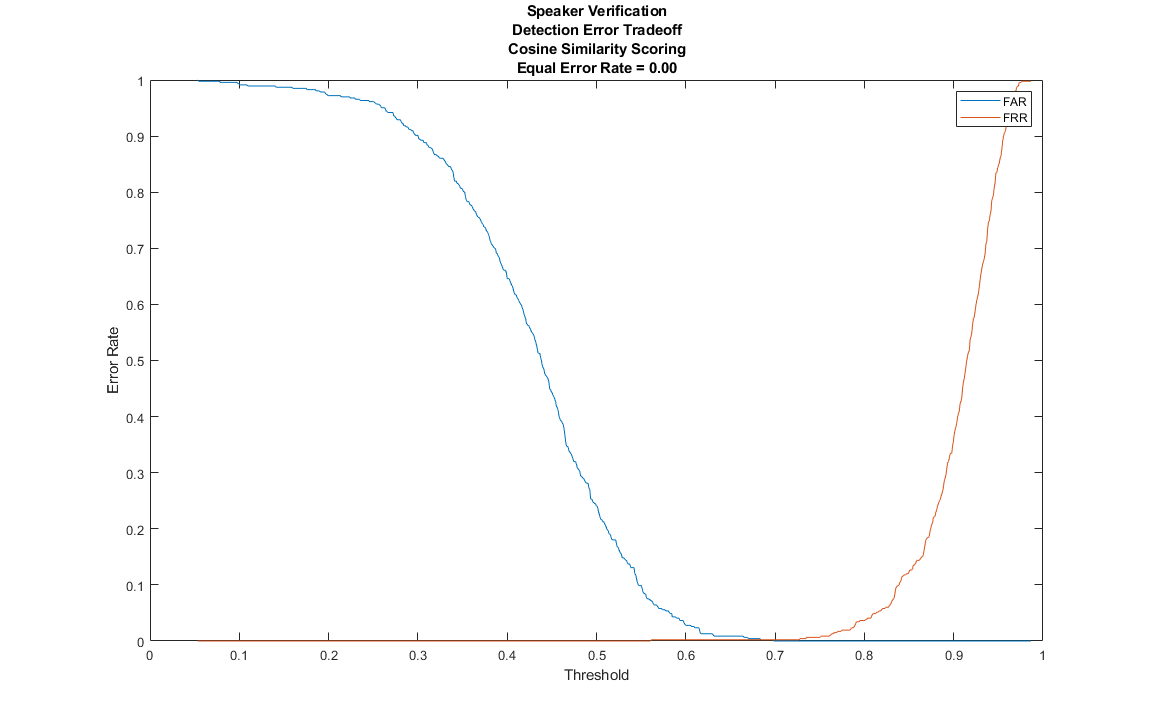 plot(detTable.CSS.Threshold,detTable.CSS.FAR, ... detTable.CSS.Threshold,detTable.CSS.FRR) eer = helperEqualErrorRate(detTable.CSS); title(sprintf('Speaker Verification\nDetection Error Tradeoff\nCosine Similarity Scoring\nEqual Error Rate = %0.2f',eer)); xlabel('Threshold') ylabel('Error Rate') legend({'FAR','FRR'})
