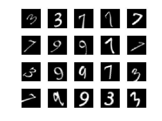 % Load the training data into memory [xTrainImages,tTrain] = digitTrainCellArrayData; % Display some of the training images clf for i = 1:20 subplot(4,5,i); imshow(xTrainImages{i}); end