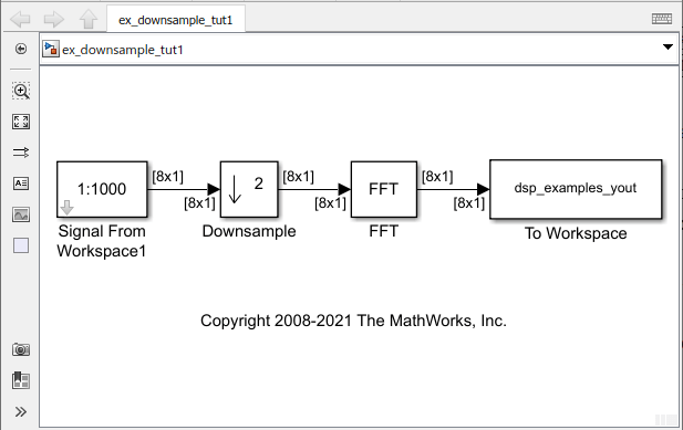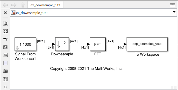 Во вкладке Debug выберите Information Overlays> Signal Dimensions. Когда вы запускаете модель, размерности сигналов появляются рядом с линиями, соединяющими блоки. Размерности сигнала в модели подтверждают, что формат кадра сигнала уменьшается на коэффициент 2 между вводом и выводом блока Downsample.