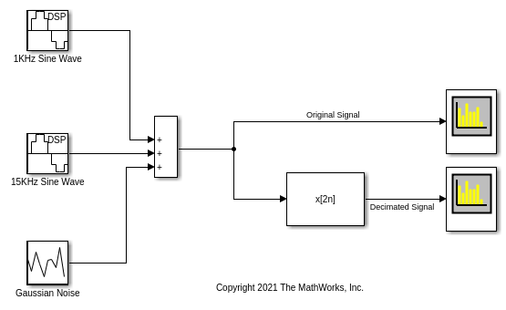 f1 = 1000; f2 = 3000; Fs = 8000; source = dsp.SineWave('Frequency',[f1,f2],'SampleRate',Fs,... 'SamplesPerFrame',1026); specanainput = dsp.SpectrumAnalyzer('SampleRate',Fs,... 'PlotAsTwoSidedSpectrum',false,... 'ShowLegend',true,'YLimits',[-120 40],... 'Title','Noisy Input signal',... 'ChannelNames', {'Noisy Input'}); specanaoutput = dsp.SpectrumAnalyzer('SampleRate',Fs/3,... 'PlotAsTwoSidedSpectrum',false,... 'ShowLegend',true,'YLimits',[-120 40],... 'Title','Filtered output',... 'ChannelNames', {'Filtered output'});