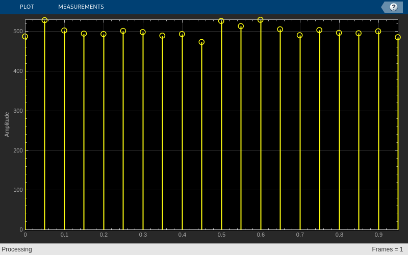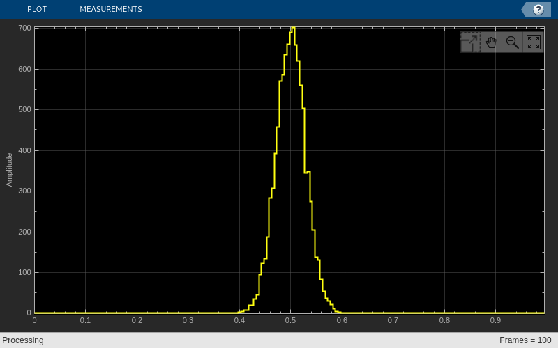 show(scope); for ii = 1:numtrials r = rand(numsamples,1)+r; hst = histcounts(r/ii,0:1/numbins:1); scope.YLimits = [min(hst)-1, max(hst)+1]; scope(hst') pause(0.1); end