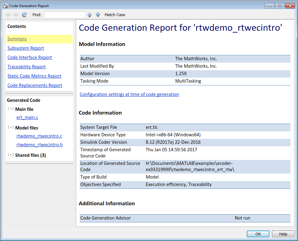 Отчет включает в себя rtwdemo_rtwecintro.c, связанные служебные и заголовочные файлы, и трассируемость и отчеты валидации.