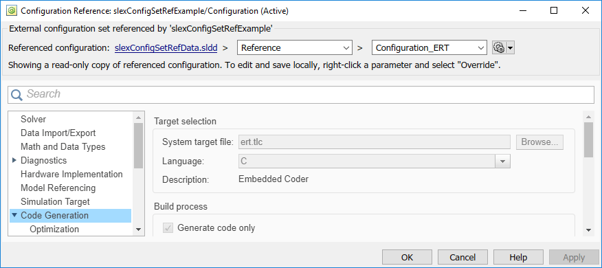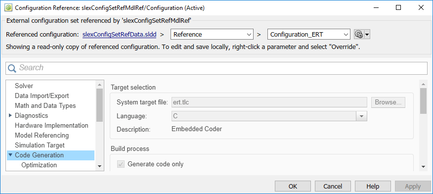 Для этой модели существует другая конфигурация модели, Configuration_AUTOSAR, который настраивается для генерации кода AUTOSAR. Наверху диалогового окна Configuration Reference, в самом правом выпадающем списке, выбирают Configuration_AUTOSAR. slexConfigSetREfExample и его модель, на которую ссылаются, slexConfigSetMdlRef, теперь оба используют конфигурацию модели, Configuration_AUTOSAR.