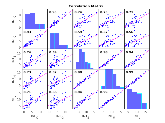 corrplot( дополнительные опции использования заданы одним или несколькими аргументами пары "имя-значение". Например, X,Name,Value)corrplot(X,'type','Spearman','testR','on') вычисляет коэффициент порядковой корреляции Копьеносца и тестирует на значительные коэффициенты корреляции.
