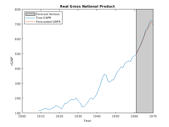 yF = forecast(PosteriorMdl,XF); figure; plot(dates,DataTable.GNPR); hold on plot(dates((end - fhs + 1):end),yF) h = gca; hp = patch([dates(end - fhs + 1) dates(end) dates(end) dates(end - fhs + 1)],... h.YLim([1,1,2,2]),[0.8 0.8 0.8]); uistack(hp,'bottom'); legend('Forecast Horizon','True GNPR','Forecasted GNPR','Location','NW') title('Real Gross National Product'); ylabel('rGNP'); xlabel('Year'); hold off