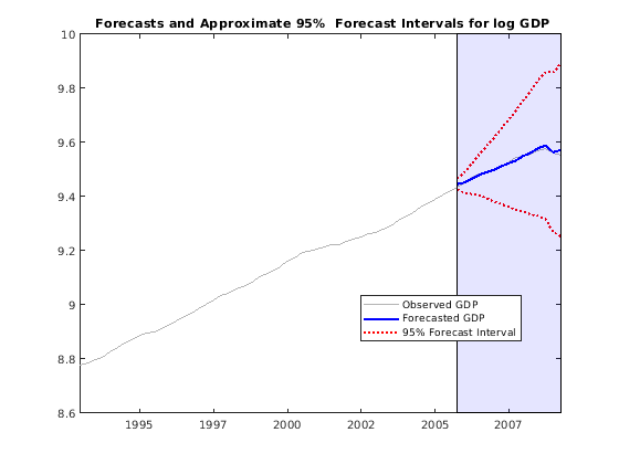 figure h1 = plot(dates(end-65:end),log(DataTable.GDP(end-65:end)),... 'Color',[.7,.7,.7]); datetick hold on h2 = plot(dates(frstHzn),gdpF,'b','LineWidth',2); h3 = plot(dates(frstHzn),gdpF+1.96*sqrt(gdpMSE),'r:',... 'LineWidth',2); plot(dates(frstHzn),gdpF-1.96*sqrt(gdpMSE),'r:',... 'LineWidth',2); ha = gca; title(['{\bf Forecasts and Approximate 95% }'... '{\bf Forecast Intervals for log GDP}']); ph = patch([repmat(dates(frstHzn(1)),1,2) repmat(dates(frstHzn(end)),1,2)],... [ha.YLim fliplr(ha.YLim)],... [0 0 0 0],'b'); ph.FaceAlpha = 0.1; legend([h1 h2 h3],{'Observed GDP','Forecasted GDP',... '95% Forecast Interval'},'Location','Best','AutoUpdate','off'); axis tight hold off