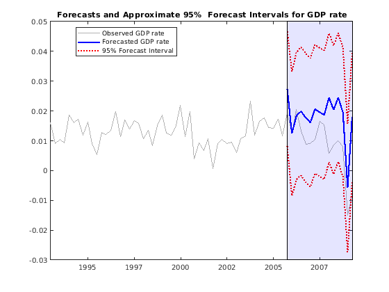 figure h1 = plot(dts(end-65:end),dlogGDP(end-65:end),... 'Color',[.7,.7,.7]); datetick hold on h2 = plot(dts(frstHzn),gdpF,'b','LineWidth',2); h3 = plot(dts(frstHzn),gdpF+1.96*sqrt(gdpMSE),'r:',... 'LineWidth',2); plot(dts(frstHzn),gdpF-1.96*sqrt(gdpMSE),'r:','LineWidth',2); ha = gca; title(['{\bf Forecasts and Approximate 95% }'... '{\bf Forecast Intervals for GDP rate}']); ph = patch([repmat(dts(frstHzn(1)),1,2) repmat(dts(frstHzn(end)),1,2)],... [ha.YLim fliplr(ha.YLim)],... [0 0 0 0],'b'); ph.FaceAlpha = 0.1; legend([h1 h2 h3],{'Observed GDP rate','Forecasted GDP rate ',... '95% Forecast Interval'},'Location','Best','AutoUpdate','off'); axis tight hold off