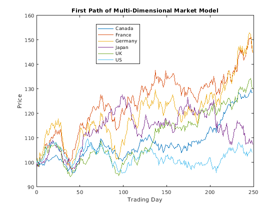 [ симулирует Paths,Times,Z] = simByEuler(MDL,NPeriods)NTrials демонстрационные пути NVars коррелированые переменные состояния управляются NBrowns Источники броуновского движения риска по NPeriods последовательные периоды наблюдения. simByEuler использует Эйлеров подход, чтобы аппроксимировать стохастические процессы непрерывного времени.