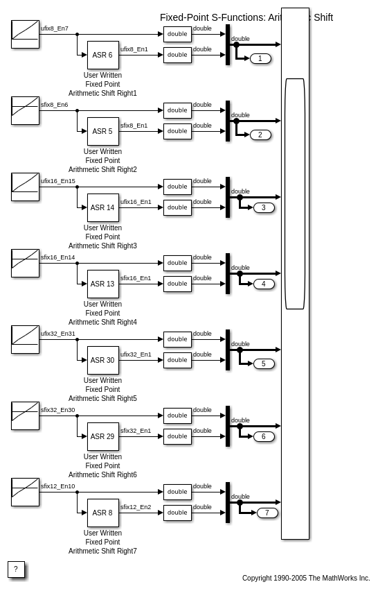 Этот пример показывает пользовательскую S-функцию языка C, записанную, чтобы выполнить арифметический сдвиг. Эта операция доступна в Simulink® с блоком "Shift Arithmetic", который может использоваться для сравнения с этим примером S-функции.