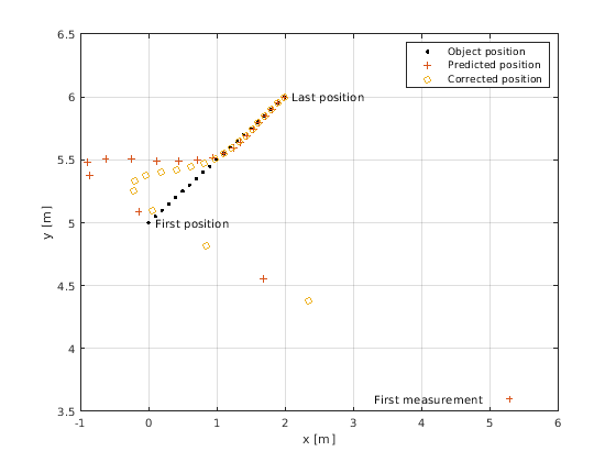 filter = trackingKF создает линейный объект Фильтра Калмана в течение дискретного времени, 2D, объект перемещения постоянной скорости. Фильтр Калмана использует значения по умолчанию для StateTransitionModel, MeasurementModel, и ControlModel свойства. Функция также устанавливает MotionModel свойство к '2D Constant Velocity'.