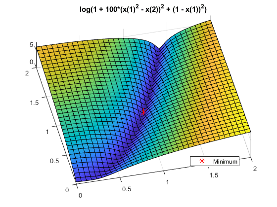 fsurf(@(x,y)log(1 + 100*(x.^2 - y).^2 + (1 - x).^2),[0,2]) title('log(1 + 100*(x(1)^2 - x(2))^2 + (1 - x(1))^2)') view(-13,78) hold on h1 = plot3(1,1,0.1,'r*','MarkerSize',12); legend(h1,'Minimum','Location','best'); hold off