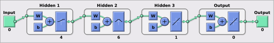 Создайте объект отображения нейронной сети, который использует нейронную сеть прямого распространения с тремя скрытыми слоями, передаточными функциями типов logsig, radbas, и purelin, и неизвестные размеры ввода и вывода.