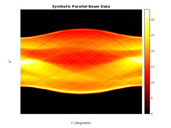 theta = 0:179; [Psynthetic,xp] = radon(ph,theta); imshow(Psynthetic,[],... 'XData',theta,'YData',xp,'InitialMagnification','fit') axis normal title('Synthetic Parallel-Beam Data') xlabel('\theta (degrees)') ylabel('x''') colormap(gca,hot), colorbar