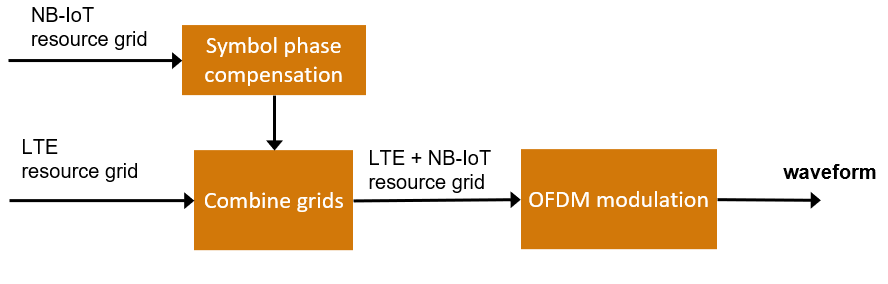 Пример комбинирует LTE и сетки ресурса NB-IoT прежде, чем сгенерировать форму волны. hNBInbandGuardbandCombineGrid функция применяет pre-OFDM компенсацию фазы символа сетке NB-IoT, чтобы иметь дело с искажением, которое приемник вводит при сдвиге принятой формы волны, чтобы принести NB-IoT в основной полосе.