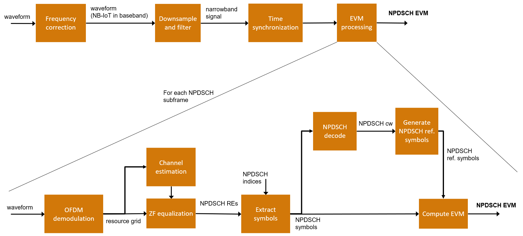 Эти рисунки показывают шаги, чтобы сгенерировать форму волны и шаги обработки в приемнике, чтобы вычислить NPDSCH EVM. Коррекция частоты в приемнике вводит смещение фазы к каждому символу OFDM. Поэтому пример применяет компенсацию фазы символа сетке ресурса NB-IoT прежде, чем объединить его с сеткой LTE.