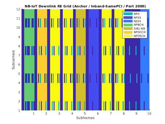 Сконфигурируйте генератор формы волны нисходящего канала NB-IoT. Пример использует NBIoTDownlinkWaveformGenerator класс, чтобы сгенерировать сетку ресурса NB-IoT. Смотрите пример Генерации сигналов Нисходящего канала NB-IoT для получения дополнительной информации о NBIoTDownlinkWaveformGenerator.