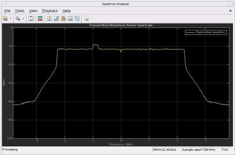 txPlot = hPlotSpectrum(txWaveform,lteInfo.SamplingRate,... 'Transmitted Waveform Power Spectrum',... {'Transmitted waveform'});