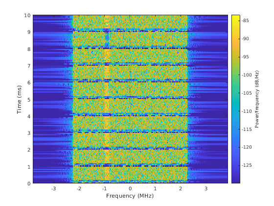 Постройте спектрограмму принятой формы волны. Этот график показывает частоту, занятую компонентом NB-IoT в полученной широкополосной форме волны.