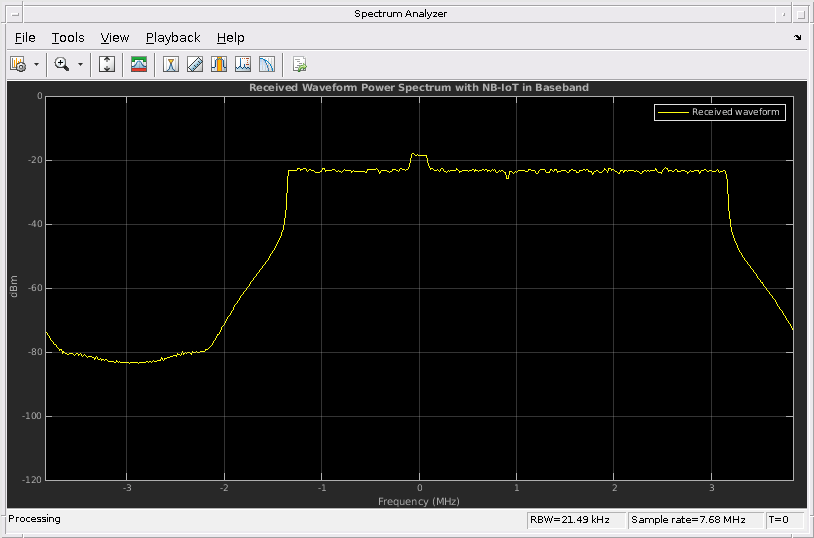 rxWaveformB = lteFrequencyCorrect(ltecfg,rxWaveform,offset); % Received waveform with NB-IoT in baseband combinedSpecPlotB = hPlotSpectrum(rxWaveformB,lteInfo.SamplingRate,... 'Received Waveform Power Spectrum with NB-IoT in Baseband',... {'Received waveform'});