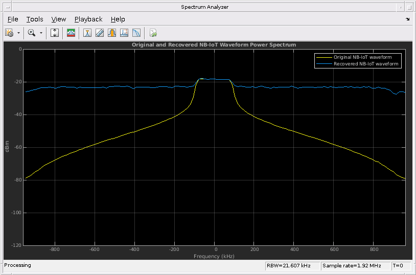filteredSpecPlot = ... hPlotSpectrum([nbWaveform/OSR*db2mag(nbPowerBoost),rxwave],nbInfo.SamplingRate,... 'Original and Recovered NB-IoT Waveform Power Spectrum',... {'Original NB-IoT waveform','Recovered NB-IoT waveform'});