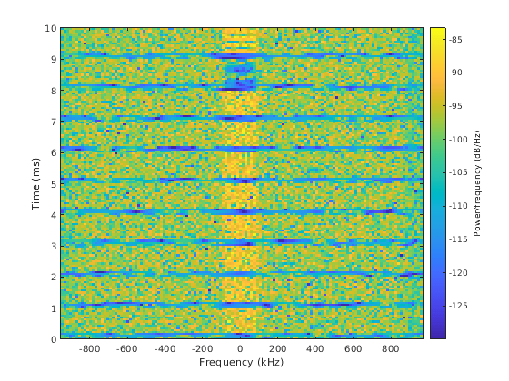 Постройте спектрограмму восстановленной формы волны NB-IoT. Этот график показывает основополосную узкополосную форму волны после извлечения его от полученной широкополосной формы волны.