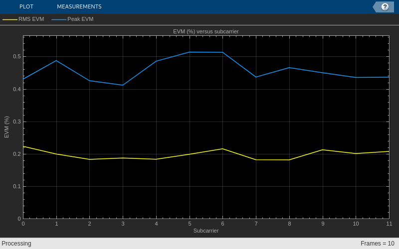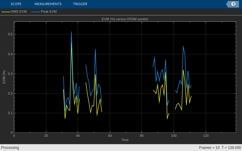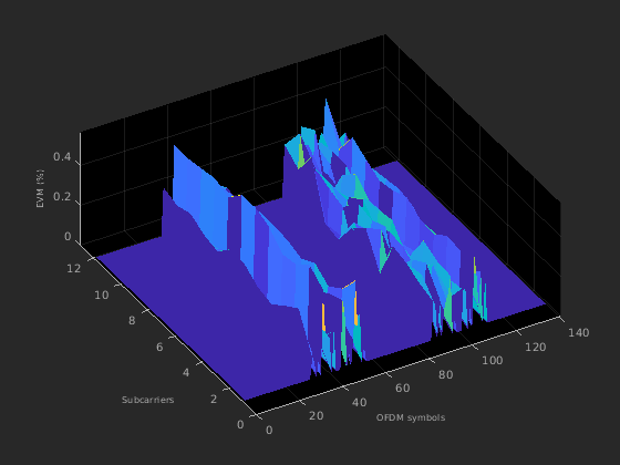 hNPDSCHEVM функция обеспечивает на подкадр и средние измерения EVM. Пример также отображает графики с EVM по сравнению со временем и поднесущими.