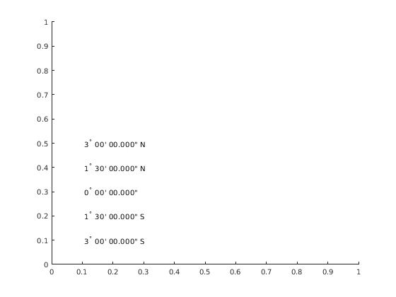 str = angl2str(angle) преобразует числовой вектор из углов в градусах к символьному массиву. Цель этой функции состоит в том, чтобы превратить переменные с угловым знаком в векторы символов, подходящие для отображения карты.