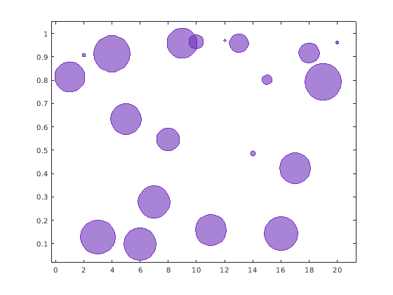 x = 1:20; y = rand(1,20); sz = rand(1,20); bubblechart(x,y,sz);
